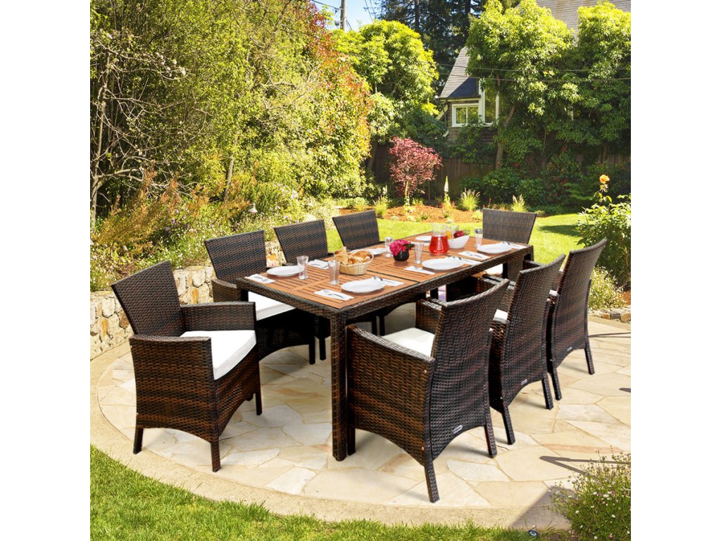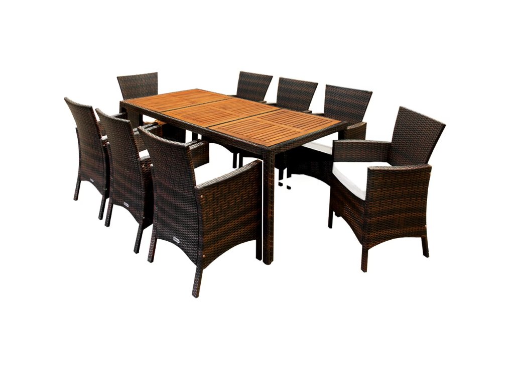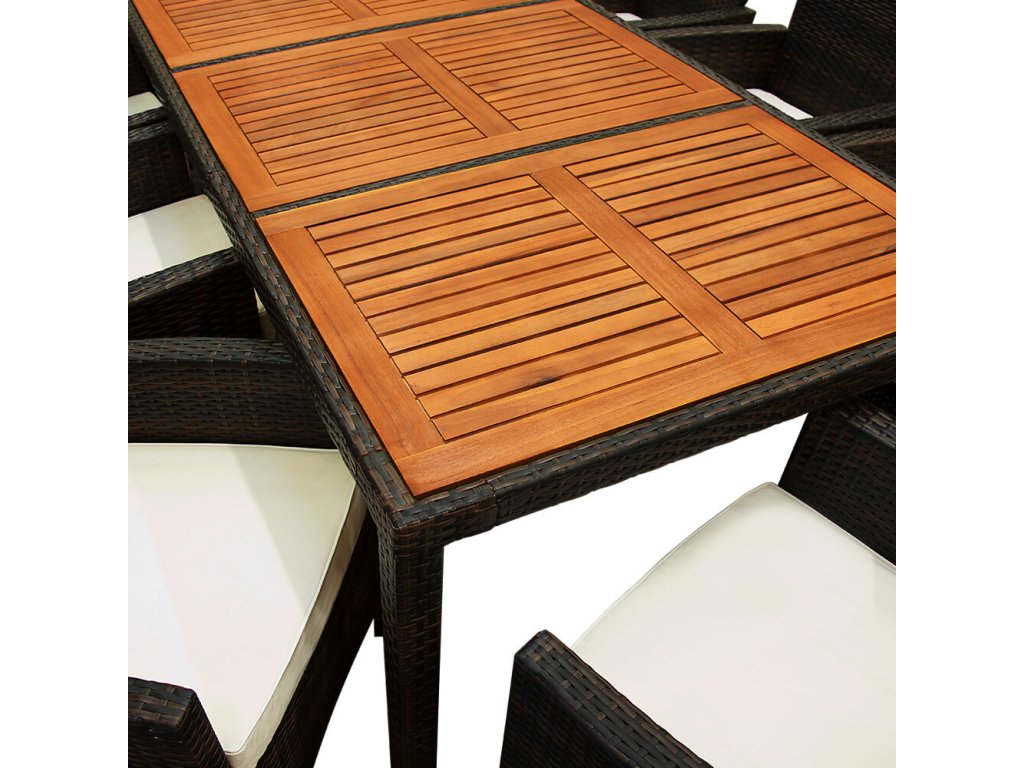 Ezzel az exkluzív kerti készlettel élvezheti a kényelmet és a modern megjelenést. A masszív akácfából készült asztal és a nyolc tágas szék kombinációja ideális helyet teremt a családdal vagy barátokkal töltött közös pillanatokhoz.A 190x90x75 cm méretű asztal elegendő helyet biztosít a szervírozáshoz, és masszív fa lapja elegánsan és természetesen hat. A 7 cm vastag ülőpárnákkal rendelkező székek maximális kényelmet biztosítanak, a huzatokat egyszerűen moshatjuk 30 °C-on. A 160 kg teherbírás és az extra széles ülőfelület támlákkal stabilitást biztosít hosszabb ülés esetén is.A polyrattan ellenáll az UV sugárzásnak és az időjárás hatásainak, és az akácfával együtt garantálja a hosszú élettartamot és az egyszerű karbantartást. Az asztal és a székek időtlen designja minden kertbe, teraszra vagy erkélyre illik, és kellemes hangulatot teremt a mindennapi ülőalkalmakhoz.A termék előnyei: