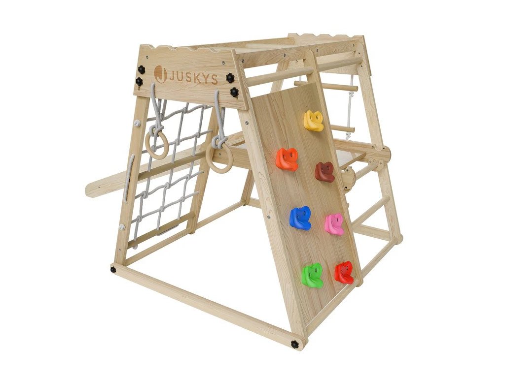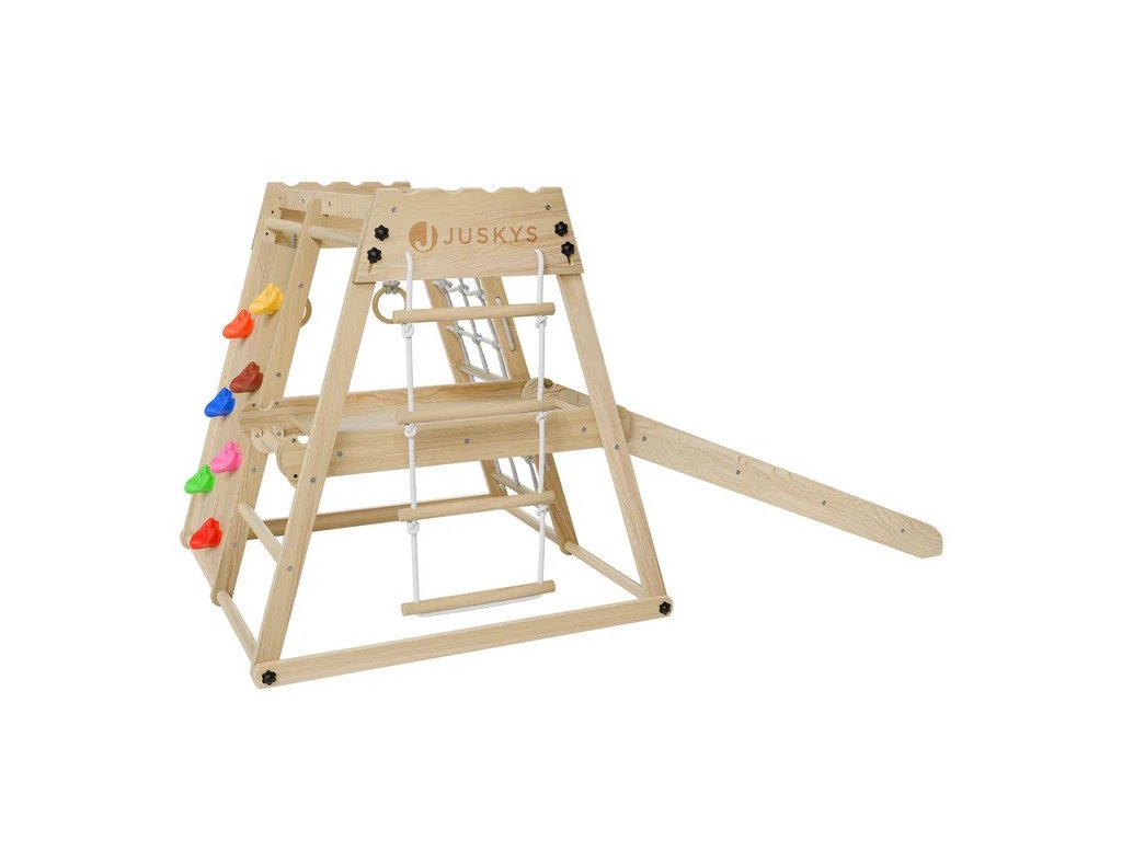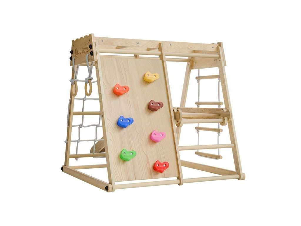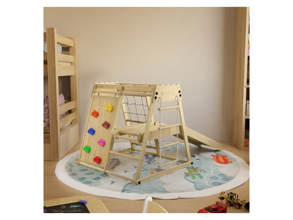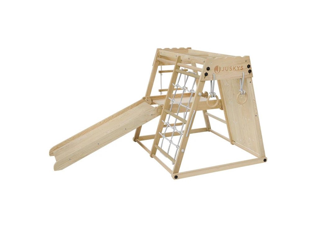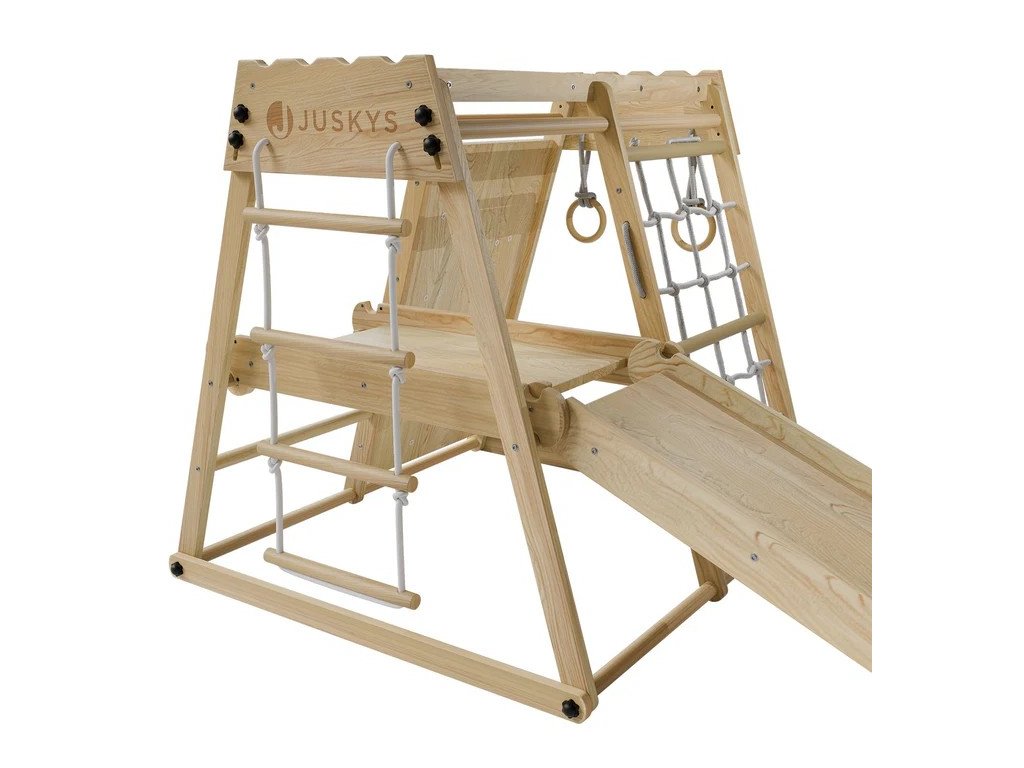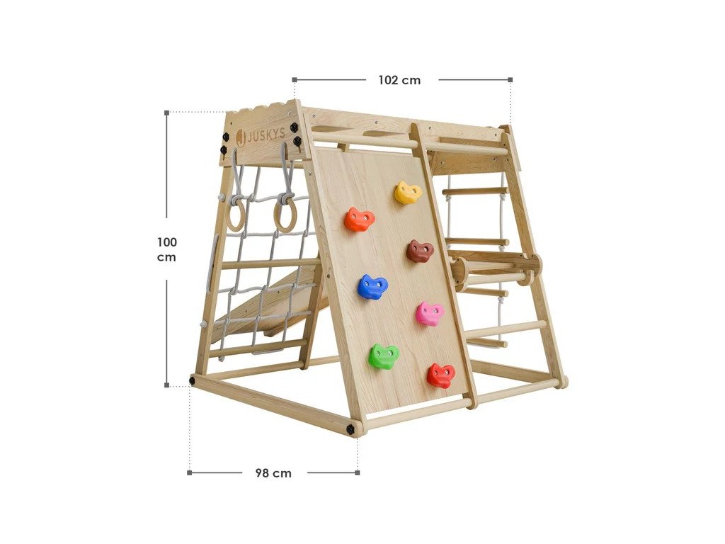 A multifunkcionális játszótér csúszdát, mászófalat, hálót, tornagyűrűket és kötélletrát kombinál. A stabil boróka fából készült szerkezet biztonságot és szilárdságot biztosít, miközben támogatja a motoros készségek és a fantázia fejlődését. A belső játszótér egy átlagos gyermekszobát is kalandos központtá alakít át, tele játéklehetőségekkel. Nagy előnye a hajtogatható rendszer. Kompakt formájának köszönhetően kisebb szobákba is beilleszthető. Ezzel a játszótérrel gyermeked erőt, ügyességet és kreativitást fejleszt, miközben minden nap nagyszerűen szórakozik.Műszaki specifikációk: