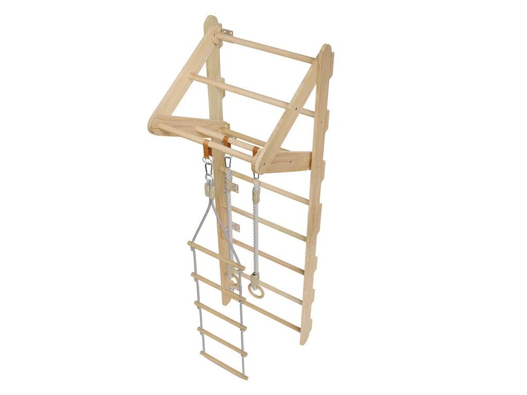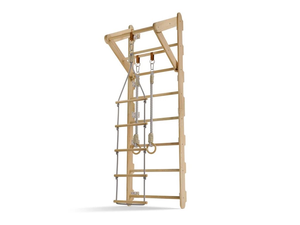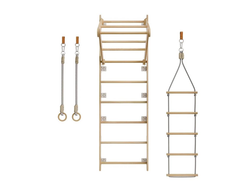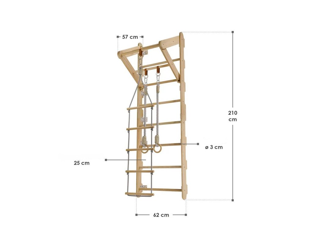 Az egyszerű szobából sportos kihívásokkal és örömökkel teli hely lesz. A gyerekek mászhatnak, kapaszkodhatnak vagy hintázva játszhatnak. A kis kalandorok számára ez az ideális módja annak, hogy eddzenek és új készségeket szerezzenek. A stabil fa szerkezet szilárdságot és biztonságot nyújt, míg a természetes megjelenés tökéletesen illeszkedik bármelyik szobába. A matrac vagy alátét hozzáadását javasoljuk az aljához, hogy a hely még biztonságosabb legyen. A tornagyűrűk és az eltávolítható kötélletra további játéklehetőségeket kínálnak, miközben támogatják az egyensúlyfejlesztést, a koordinációt és az erőt.Műszaki specifikációk:
