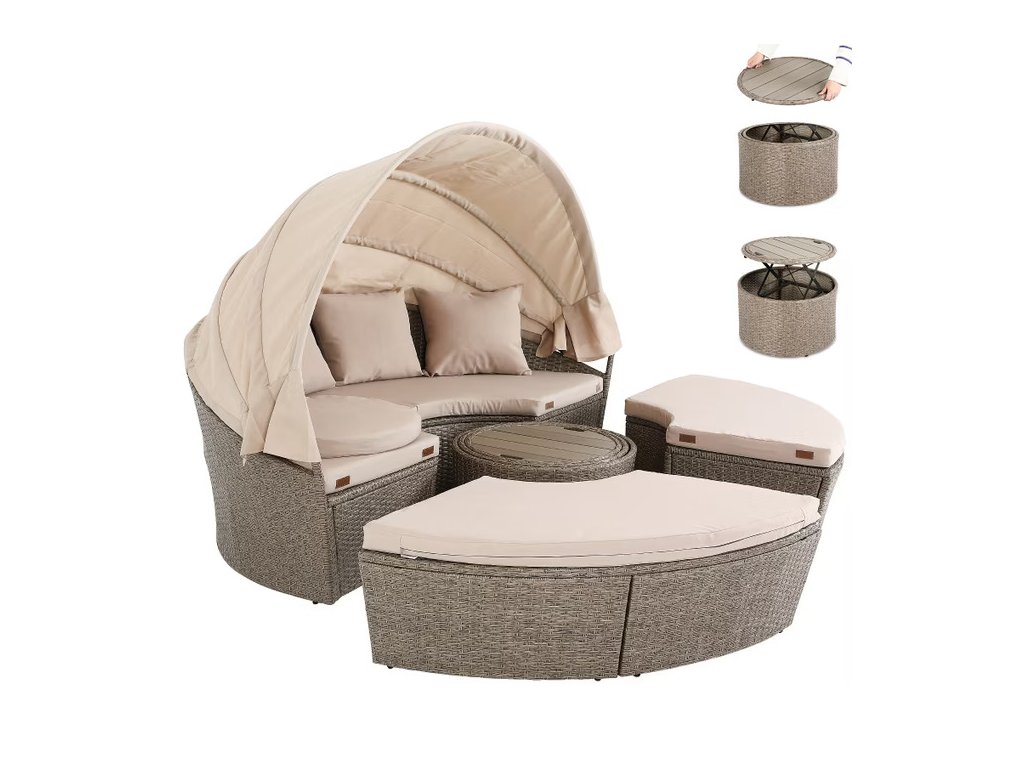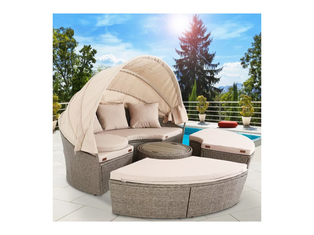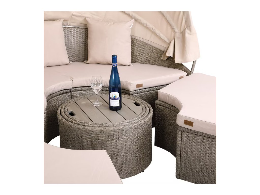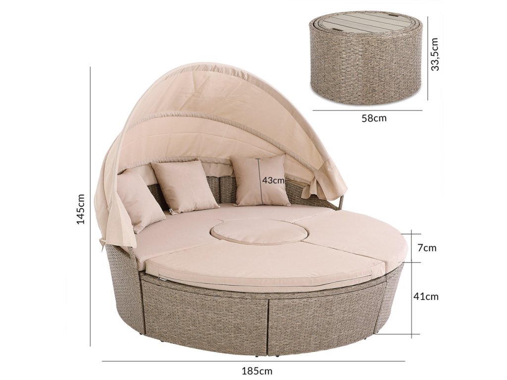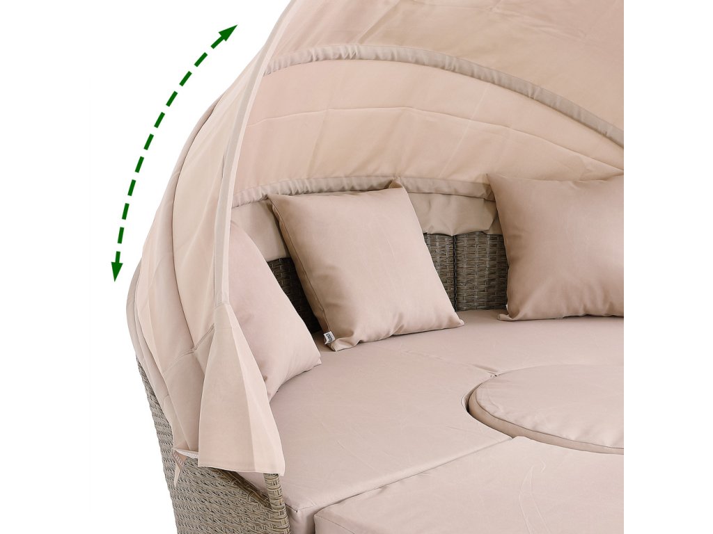 A gázrugók segítségével felhajtható, összecsukható napellenző kellemes árnyékot ad, miközben véd a szél ellen. A pihenőhely könnyen átalakítható asztallá és kényelmes ülőhelygé. Az ágy egyes részei praktikus összekötő kapcsok segítségével szilárdan összekapcsolhatók, így egyszerű és hatékony megoldás jön létre. A fémkeret állítható lábakkal van ellátva, amelyek lehetővé teszik a biztonságos állást még egyenetlen talajon is.