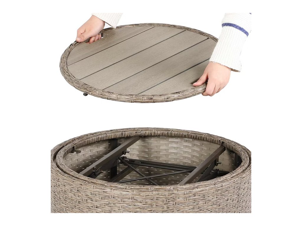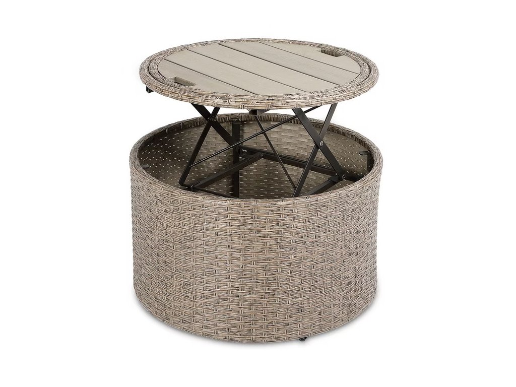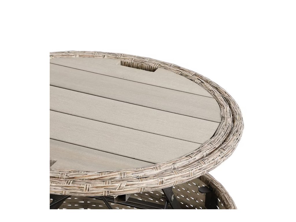 A polyrattan egy rendkívül tartós, egyenletes szövésű műanyag, amelyet kifejezetten kerti bútorokhoz terveztek. Előnye a könnyű karbantartás és a szennyeződésekkel szembeni ellenállás. A WPC teleszkópos asztal erős fa-műanyag kombinált anyagból készül, és nagyon gyorsan és egyszerűen felállítható. Az asztallap tálcaként is szolgál, és három állítható magasságú, csúszásmentes műanyag lábbal van ellátva a stabilitás érdekében. Az asztal további belső polirattan megerősítéssel is rendelkezik, a belső tér pedig tárolásra is használható. A levehető üléshuzat 7 cm vastag ülőpárnákkal taszítja a vizet, és a rejtett cipzárnak köszönhetően könnyen levehető.