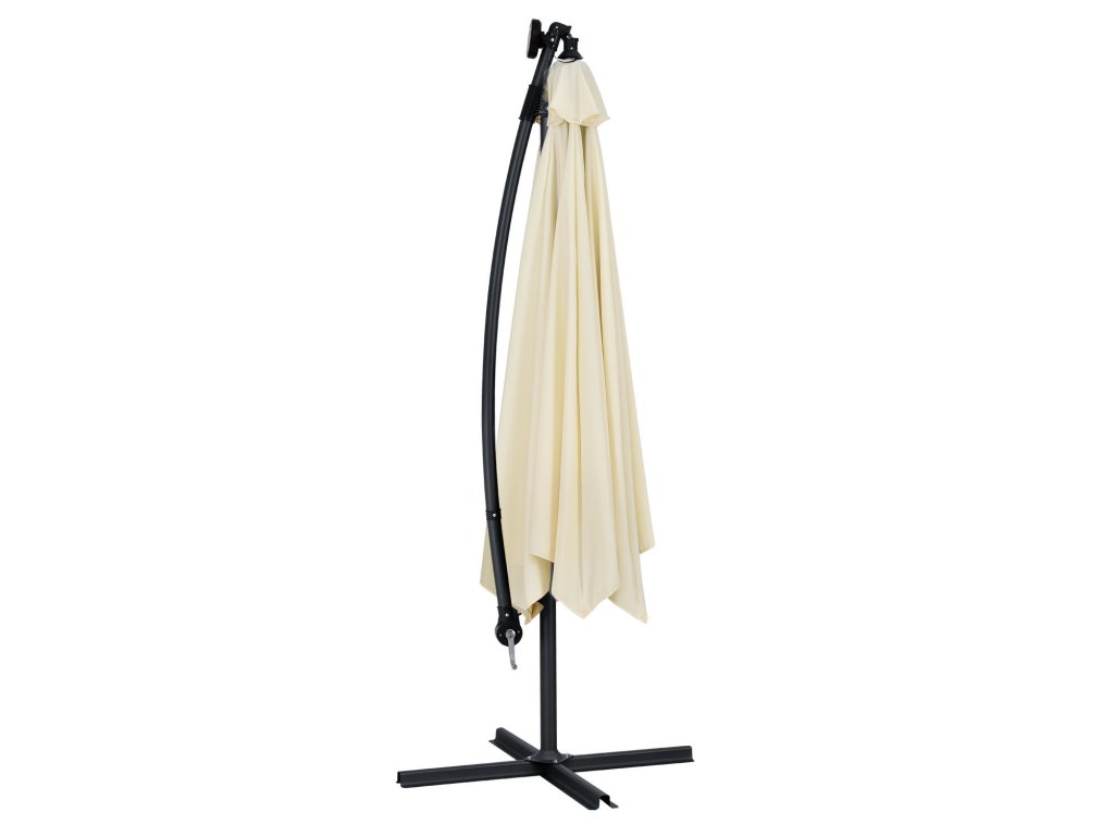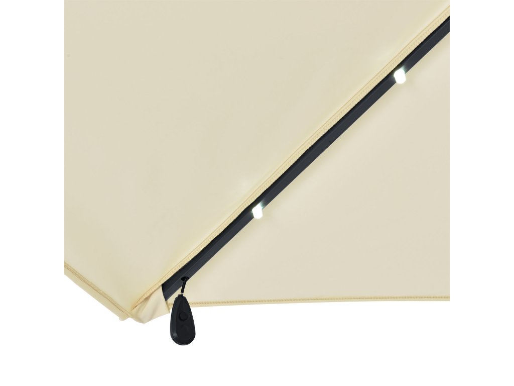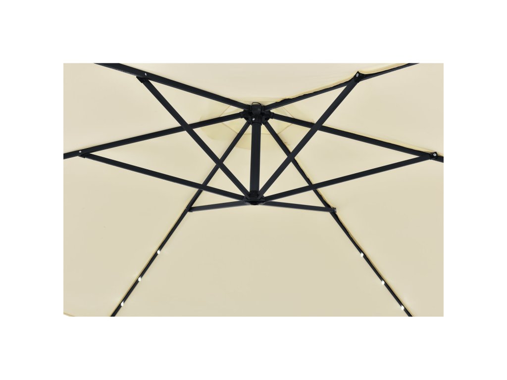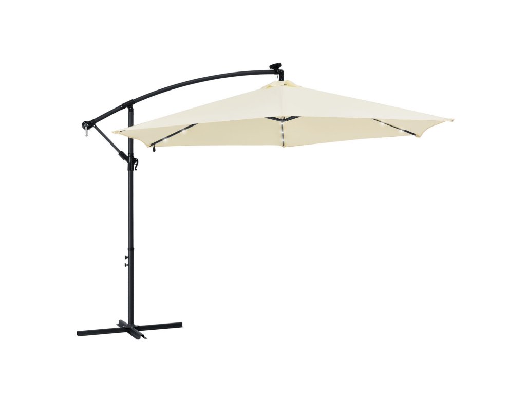 A krémszínű LED világítású napernyő tökéletes kiegészítője az erkélynek, terasznak, medencének vagy kertnek. A 350 cm átmérőjű napernyő megvéd a tűző naptól és a veszélyes UV sugárzástól. A szövethuzat krémszínű és 160 g/m² erős poliészterből áll. A LED-lámpákat napelem modul táplálja. Sötétben a 24 LED-es lámpa kellemes hangulatot teremt, így a kertben pihenhet és élvezheti a gyönyörű nyári időt. Az oldalsó karnak köszönhetően a napernyő alatti hely optimálisan kihasználható. A fogantyúnak köszönhetően a napernyő könnyen nyitható és zárható. A karral folyamatosan állítható a dőlésszög, így a napernyőt a nap helyzetéhez igazíthatja. A napernyő 100 x 100 cm-es kereszt alakú állványra van rögzítve, és szinte bármilyen szilárd felületre felhelyezhető. Az állványt téglalap alakú súlyokkal kell megerősíteni. Az állvány, a kar és a támasztékok porszórt acélból készülnek.