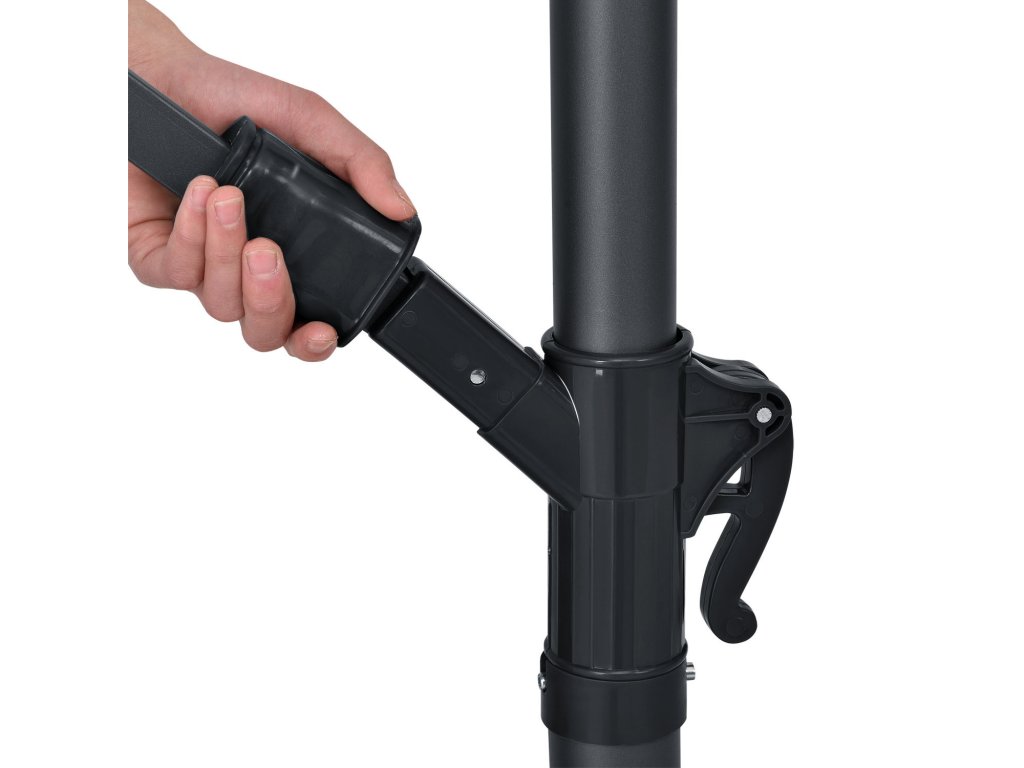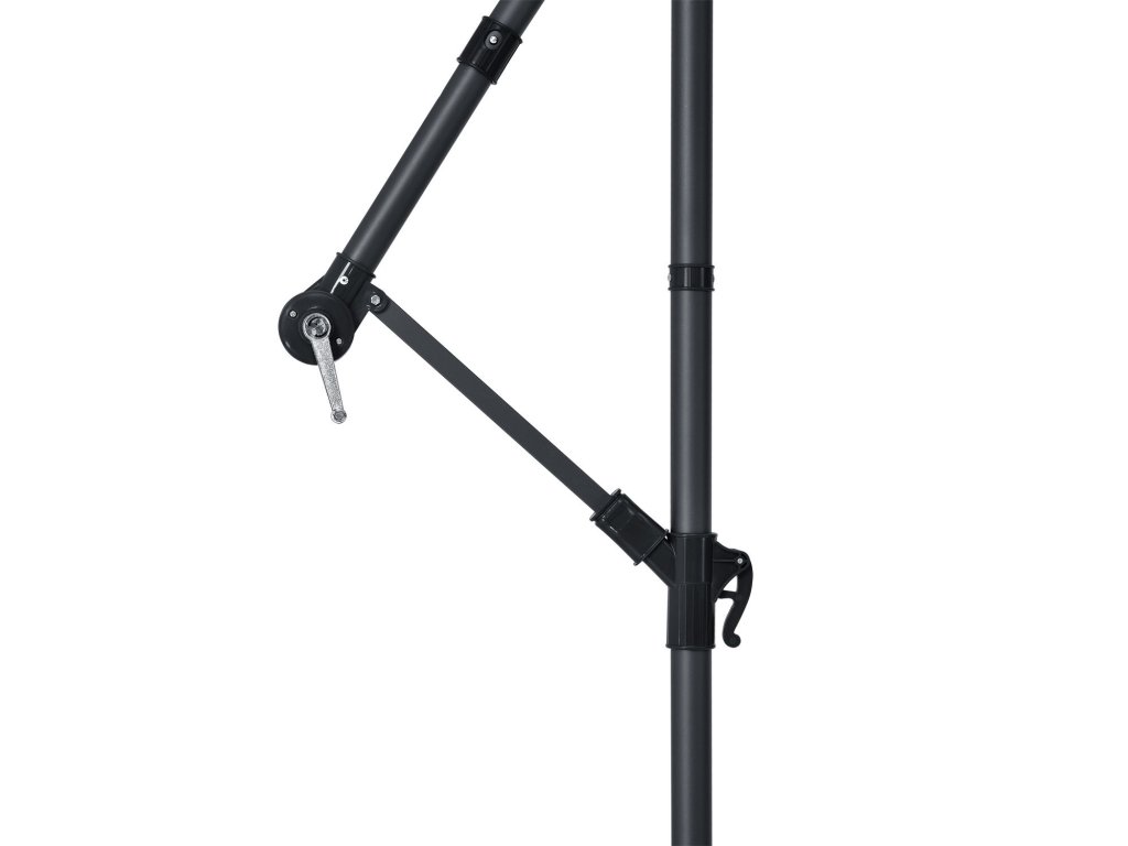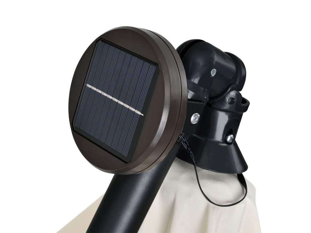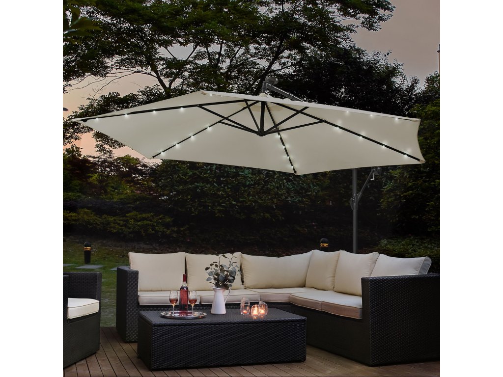 A krémszínű LED világítású napernyő tökéletes kiegészítője az erkélynek, terasznak, medencének vagy kertnek. A 350 cm átmérőjű napernyő megvéd a tűző naptól és a veszélyes UV sugárzástól. A szövethuzat krémszínű és 160 g/m² erős poliészterből áll. A LED-lámpákat napelem modul táplálja. Sötétben a 24 LED-es lámpa kellemes hangulatot teremt, így a kertben pihenhet és élvezheti a gyönyörű nyári időt. Az oldalsó karnak köszönhetően a napernyő alatti hely optimálisan kihasználható. A fogantyúnak köszönhetően a napernyő könnyen nyitható és zárható. A karral folyamatosan állítható a dőlésszög, így a napernyőt a nap helyzetéhez igazíthatja. A napernyő 100 x 100 cm-es kereszt alakú állványra van rögzítve, és szinte bármilyen szilárd felületre felhelyezhető. Az állványt téglalap alakú súlyokkal kell megerősíteni. Az állvány, a kar és a támasztékok porszórt acélból készülnek.