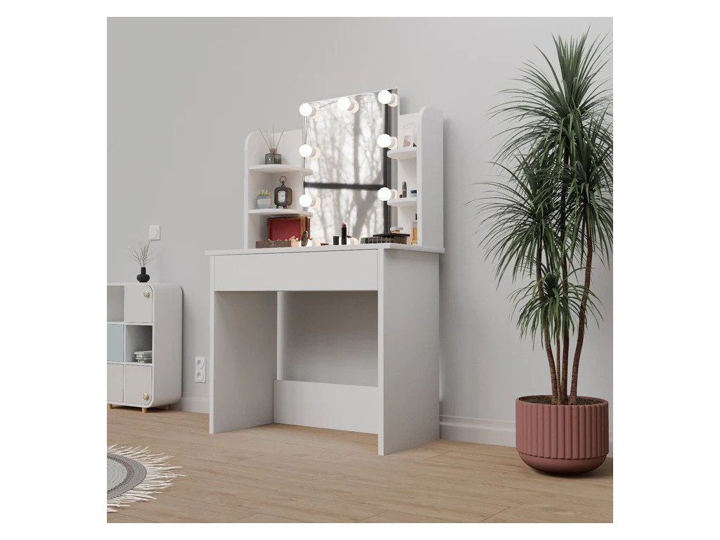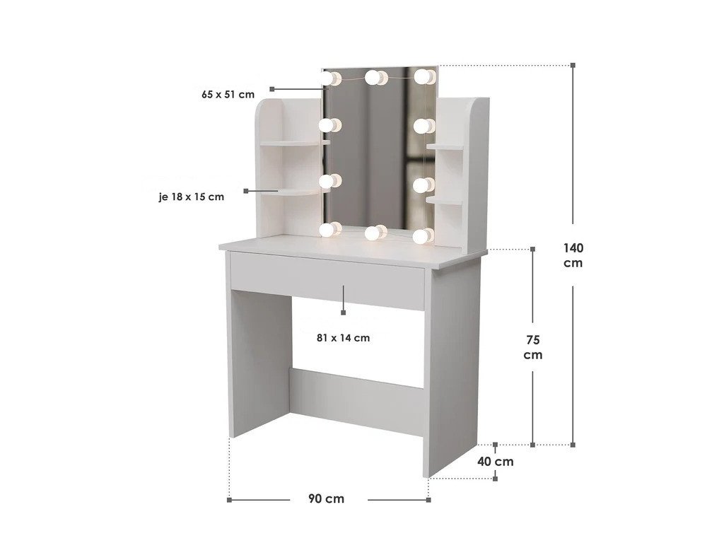 Ez az asztal tiszta vonalakkal és funkcionális kialakítással tűnik ki, amely jól illik a hálószobába, öltözőbe és a tinédzser szobába. A nagy tükör LED világítással ideális körülményeket biztosít a sminkeléshez vagy a hajformázáshoz. A tíz LED izzó világos és egyenletes fényt biztosít, ami kellemes a szemnek. A praktikus fiók és nyitott polcok elegendő helyet biztosítanak a sminknek, parfümöknek és ékszereknek. Az asztal szélessége csak 90 cm, így kisebb helyiségekbe is befér. A robustus konstrukció akár 50 kg-ot is elbír, és a melamin felületnek köszönhetően tartós és könnyen tisztítható.Műszaki specifikációk:
