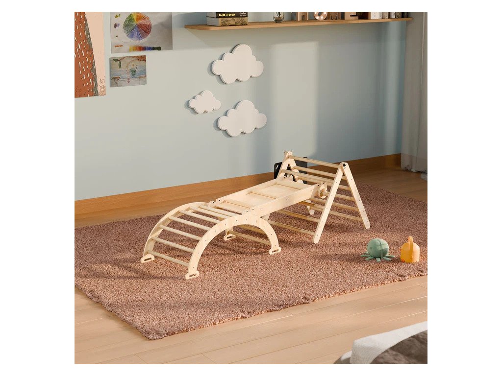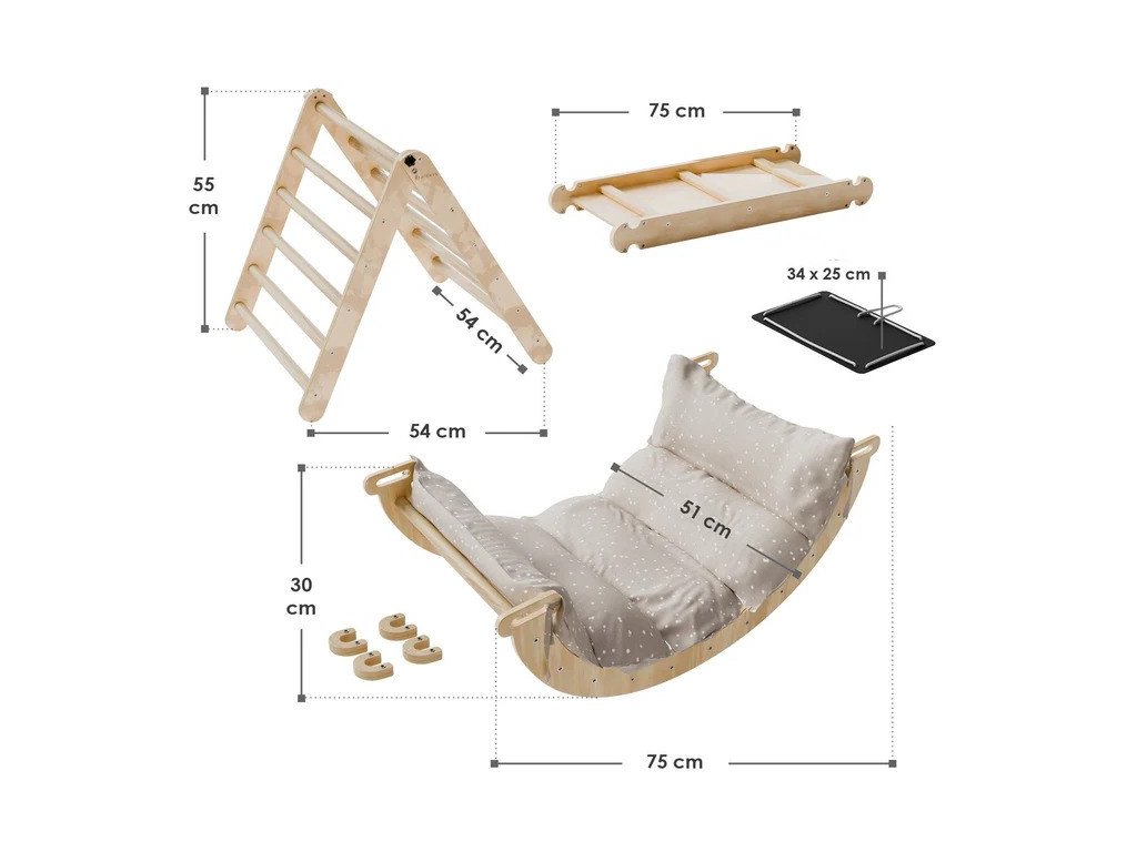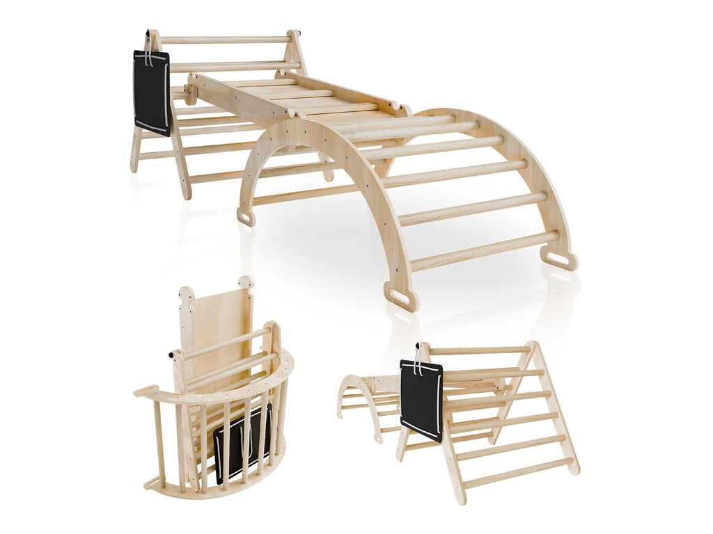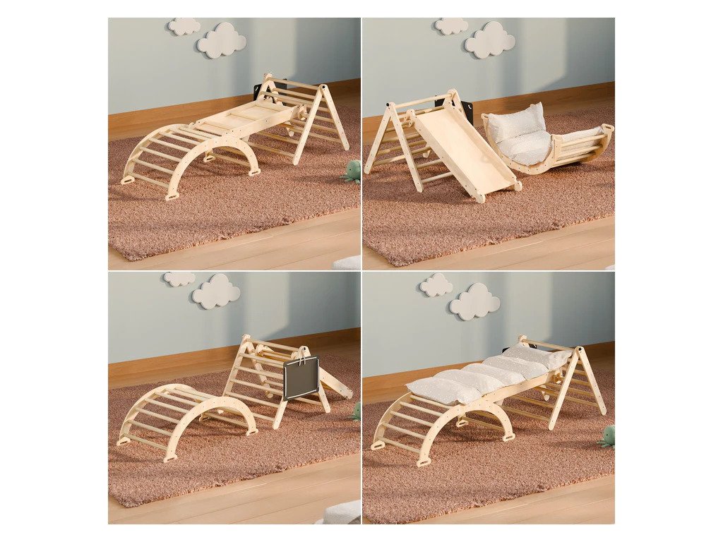 Széleskörű mászó készlet a mászó háromszög, ív, csúszda és más elemekkel szüntelen, biztonságos és változatos szórakozást kínál gyermekeinek minden időjárási körülmények között. A egyénileg kombinálható elemek és a kényelmes párnák végtelen lehetőséget kínálnak rugalmas és helytakarékos játékterületek létrehozására. A robosztus konstrukció és a magas minőségű kivitelezés nagyobb biztonságot és stabilitást biztosít a mászás és torna során. Gyermekének biztonsága érdekében mindig használjon puha alátétet, például a mászó háromszög alá, és figyeljen a gyermekre a játék során.Műszaki specifikációk: