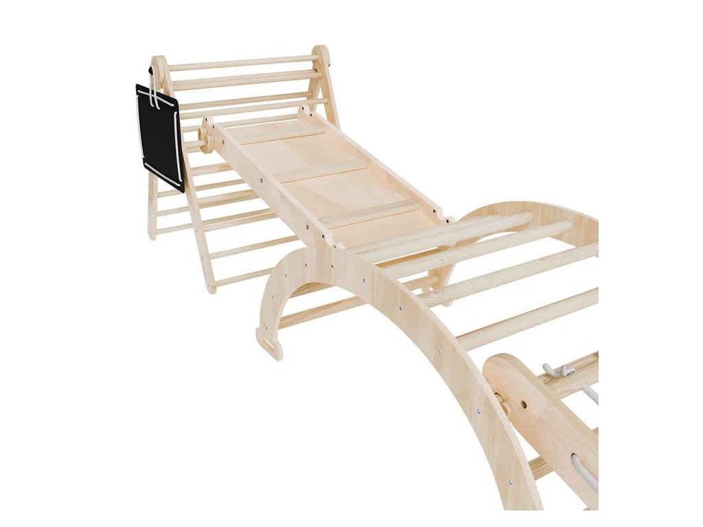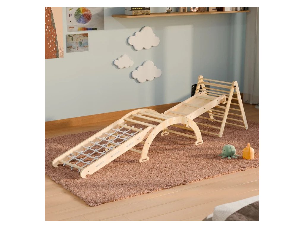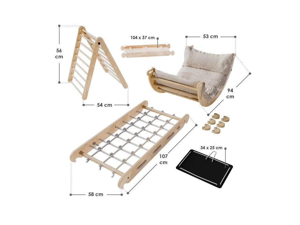Széleskörű mászókészlet a mászóháromszög, ív, csúszda és további elemekkel folyamatos, biztonságos és változatos szórakozást kínál gyermekének minden időjárási körülmények között. A egyéni kombinációban használható elemek és a kényelmes párnák végtelen lehetőséget kínálnak rugalmas és helytakarékos játékterületek kialakítására. Robusztus konstrukció és a magas minőségű kivitelezés nagyobb biztonságot és stabilitást biztosít a mászás és torna során. Gyermekének biztonsága érdekében mindig használjon puha alátétet, például a mászóháromszög alá, és figyeljen a gyermekre a játék során.Műszaki specifikációk: