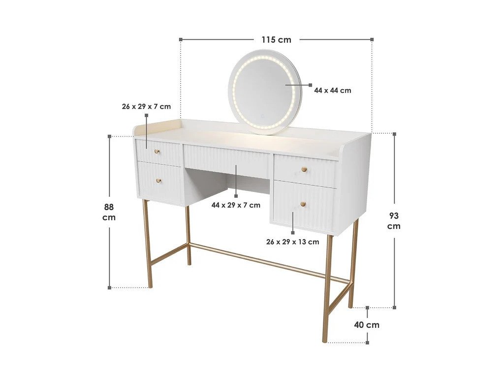 Az elegáns design összefonódik a praktikus tárolóhellyel minden kozmetikai szükséglet számára. A fehér szín és az arany színű fém lábak kombinációja luxus és időtlen hatást kelt. Az asztal kör alakú LED tükörrel rendelkezik érintővezérléssel, amely lehetővé teszi a világítás beállítását a napszak és a smink típusa szerint. Öt tágas fiók elegendő helyet biztosít a sminknek, ékszereknek és apró kiegészítőknek. A masszív szerkezet stabilitást és tartósságot garantál, az asztal pedig akár 50 kg-ot is elbír. A 115 cm szélességének köszönhetően kisebb helyiségekbe is beilleszthető. Sima felülete könnyen tisztán tartható. Elegendő egy nedves ronggyal áttörölni, és újra úgy néz ki, mint újkorában.Műszaki specifikációk: